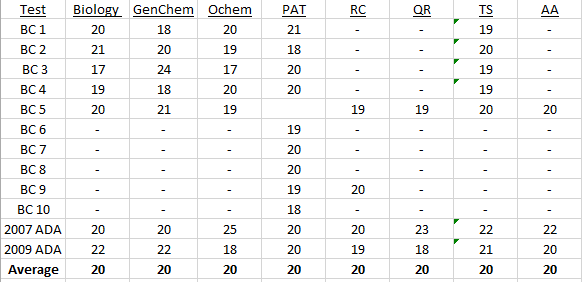 DAT: 20AA, 20TS, 21PAT, 19BIO, 20GC, 23OC, 21RC, 17QR (Embarrassing)