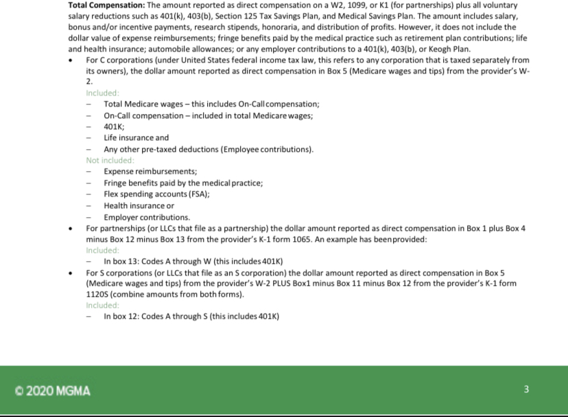 You can google what MGMA defines as “total compensation” but the answer is no as far as I can tell. Total comp is salary + signing bonus + RVU/quality bonuses.Since MGMA gives "total compensation," is it a fair estimate to subtract 30% from the number given to get rid of the "benefits" portion and arrive at average salary?