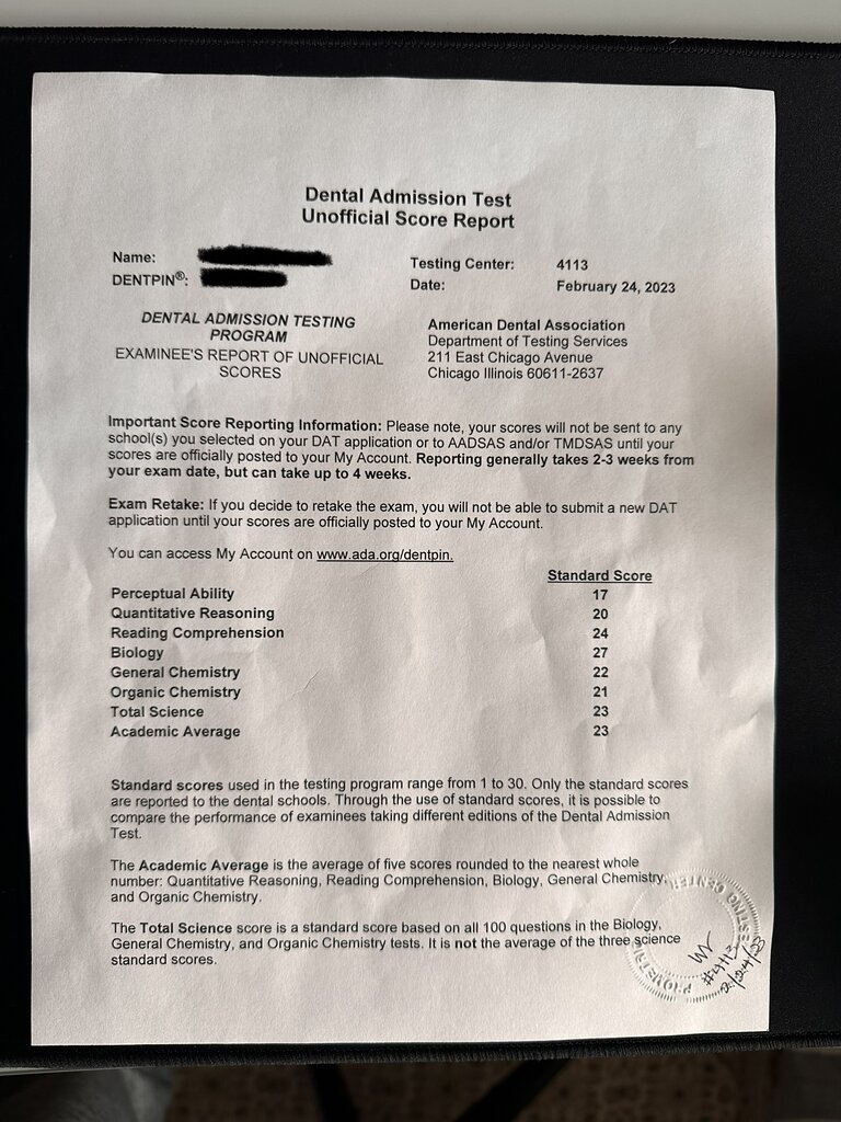 - January 2023 : After that practice test, I scheduled my actual test for February 2023. From the day I scheduled my test, to the day before test day, I just grinded practice exam questions. I went through all timed and untimed practice tests for OC, GC, QR and BIO multiple times, until I was consistently scoring 25 and above on these practice tests. I also went through about 5 full length practice tests, to build up my stamina for the actual test. THIS IS VERY IMPORTANT. The DAT is a long test, and is mentally exhausting. You have to know what you’re up against and although it is not necessary to go through all the full length timed practice exams, it's important to run through a few just to get a general idea of the timing of the test, as well as the order of sections, and different strategies you can use.