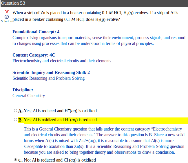 I think I would have gotten it correct through POE, but I don't understand why the key says a new solid is formed when Al is mixed with Zn2+ (It did not say Zn and Al was in the same beaker).