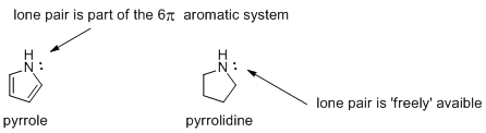 Ok, lets look at the classic example of pyrollidine and its aromatic cousin, pyrrole.