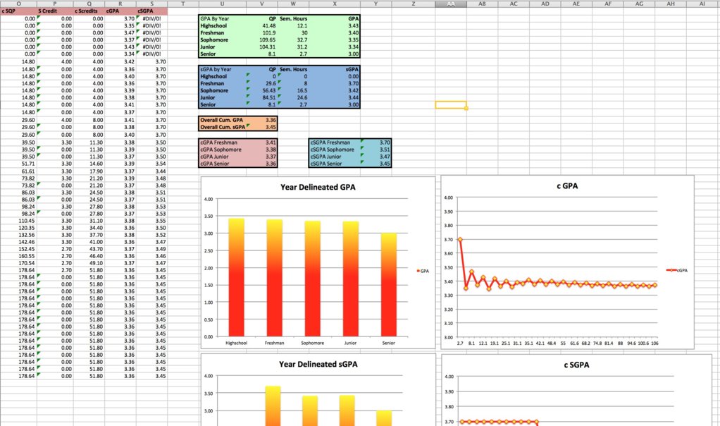 So being that my job title is "Revenue and procurement financial systems analyst", I can summarize half of my job as being an excel/sql geek. I wanted a easy way to visualize and summarize many different aspects of my school career, so I put together a quick excel with a few options that I didn't see with other gpa calculators out there.