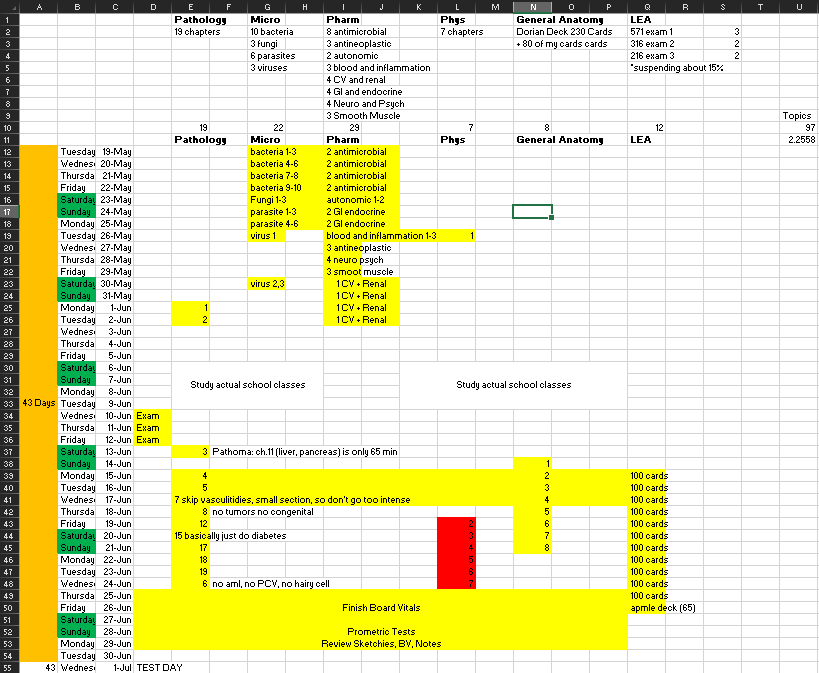Schedule / study strategy: Here's (below) the study schedule I made for myself. Yellow highlights were just notes to myself that I had completed that "assignment". As you can see on there, I had phys listed (was going to use BRS) but then after doing board vitals questions, decided not do continue with BRS physiology. The schedule may look a little weird, that is because this is how it