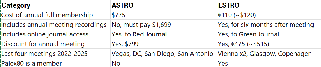I cancelled my ASTRO membership this year. I recently went to the ESTRO Annual meeting in Glasgow a few months ago. I felt that the vibe was quite different from ASTRO. Specifically, there was more emphasis on science and international collaboration with a distinctly less "used car salesman" commercialism. Plus a lot of the thought leaders from American Radiation Oncology present there anyway, so you really do get the best of all worlds.