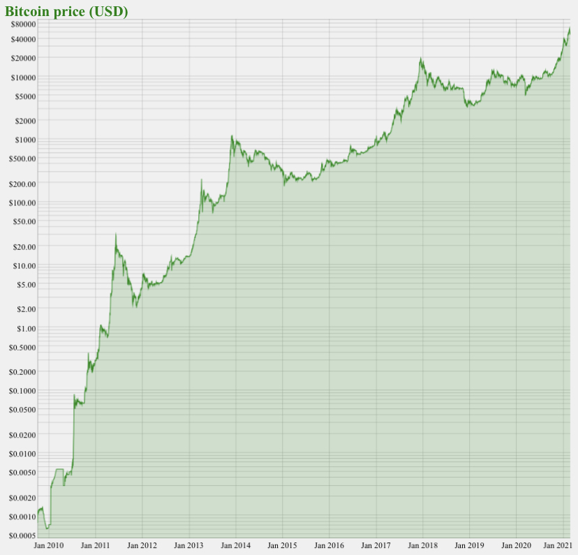I agree it’s a speculative asset but here’s an all time BTC chart. It has 10x’d every 3-4yrs. Institutional buyin makes it slightly less speculative at this point. The fact that it’s decentralized makes it less susceptible to government intervention.