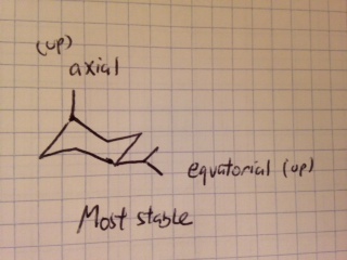 I completely understand that A is the most stable conformation because the bigger isopropyl group is on the equatorial position, while the smaller methyl group is on the axial group.