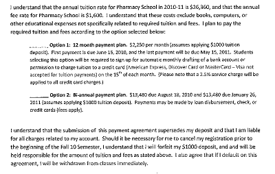School D faxed me a letter of Payment Agreement, stating on how I would like to pay for school. i.e. 12 payments or bi-annually. This is past due to turn in, and I just got the email today.