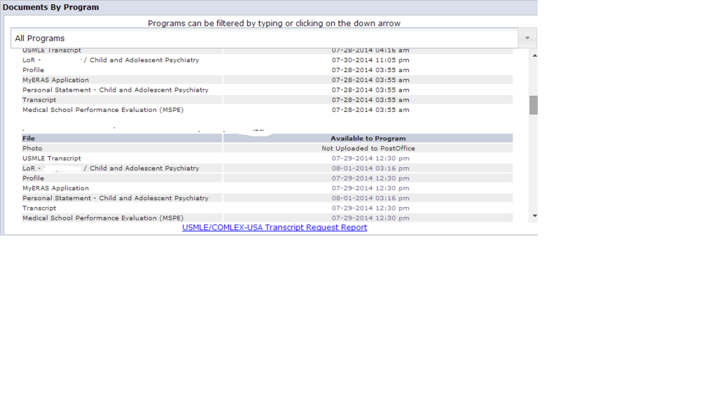 I de-identified the image below for the safety of the person that wrote me the LOR. If it gets out that they actually recommended me for anything, their judgment will forever be questioned. You can see that one is black and one is grey. Interestingly, the black one shows the actual upload/send times of when I put into the system. The grey one is later, and I think may represent a manual download or re-download. My (total) guess is that some programs have the applications automatically transmitted to them, and some manually download them. The latter may allow some degree of filtering by various statuses (AMG vs. IMG, maybe board scores) to cut down on total number of apps to review. My initial panicked reaction was that the greying out meant that the program was no longer considering me and that they had asked for ADTS to stop sending them info about me. Thankfully, this is not true either as I got an invite from the grey one (wooh!)