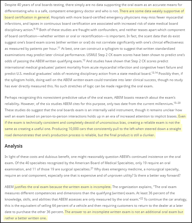 2) The ABR is wrong, has produced zero evidence supporting its current process, and 85% of medical specialties are right: oral boards are not necessary.