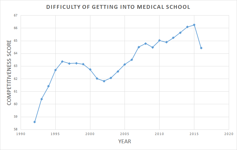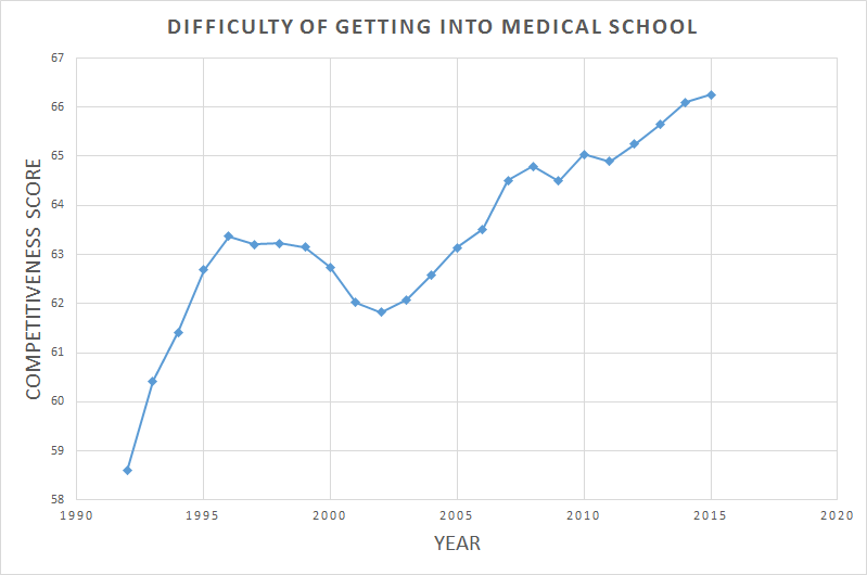 The competitiveness score represents how difficult it is to get into medical school at any given year (higher number = more difficult to get accepted).