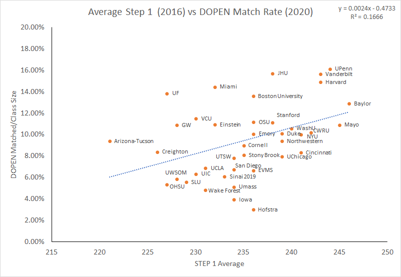 However, it is interesting that the schools with the highest proportion of students matching into DOPEN are top research universities including Vanderbilt, UPenn, JHU, and Harvard. You can view the spreadsheet linked here [outdated, making new one, please wait] for specific numbers but there is a trend for many of the top private medical schools to be very specialized. There are some schools way above the line which I did not expect based on ranking for example, Miami and University of Rochester matched a lot of DOPEN (14%). Now, whether that is variance or not requires more data but it is something to pay attention to. Note, I inputted data from other years for schools that I could not find their 2020 match list.