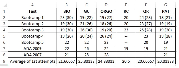 DAT Bootcamp Scores (second time taking is in parentheses)