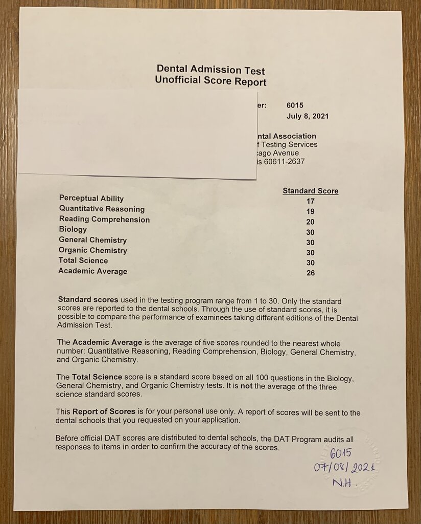 Remain confident in your abilities and do not be discouraged when practicing. I never once scored above a 21 AA on my practice exams, so, keep your head up regardless of what you are scoring. You may surpass all expectations on test day. GO AT YOUR OWN PACE. I studied well beyond the amount an average test taker does and, even then, I took the DAT only when I felt ready. Originally, my exam was scheduled for June 24th, but that first week of June I decided to push it back a couple of weeks. I wholeheartedly believe those 14 days SHOT MY SCORES UP.