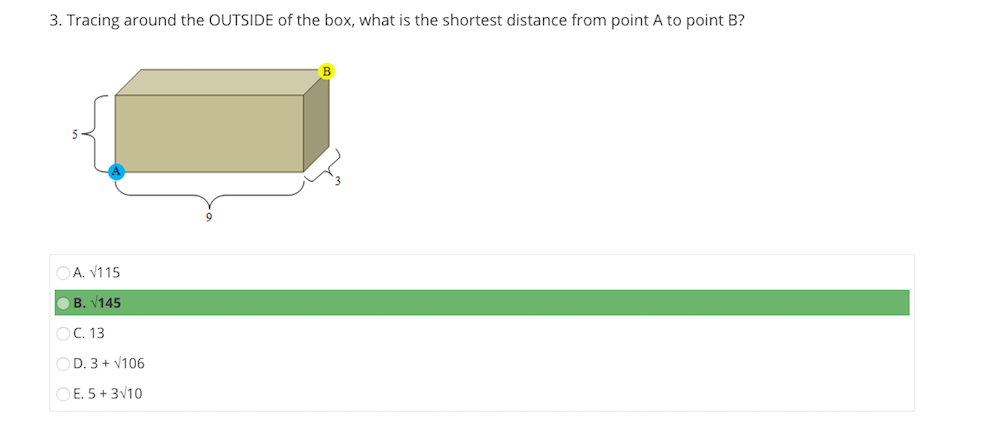 Choices D and E are the distances between the two points when one calculates the hypotenuse of one of the faces then goes along the edge.