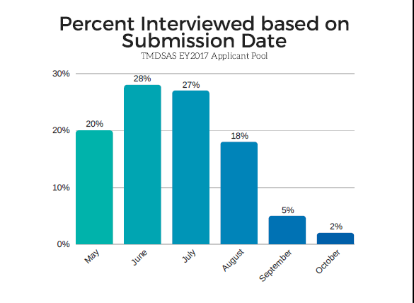 Hello SDN, I submitted my TMDSAS app late July and it wasn't processed until early September. Knowing it would take a while for the primary to get processed I took my time with secondaries and most of them I submitted either right before or a few days after my primary was processed because I was thinking that the schools wouldn't look at the app until they get my primary. So instead of submitting my secondaries close to when I submitted my primaries I submitted them more than a month later around when the primary was processed. Now its been more than two months since my primary has been processed and I have no interviews. How likely that the reason for no interviews is the timing of my secondaries?