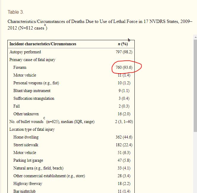 Now, let's recall that total deaths from LEO shootings for 2018 was 998. I know there are other deaths from cops that aren't gun related, but shootings are the VAST majority. I don't have stats from 2018, but a study from 2009-2012 showed firearm deaths at the hands of law enforcement to be just under 94% of all lethal uses of force by law enforcement (see below).