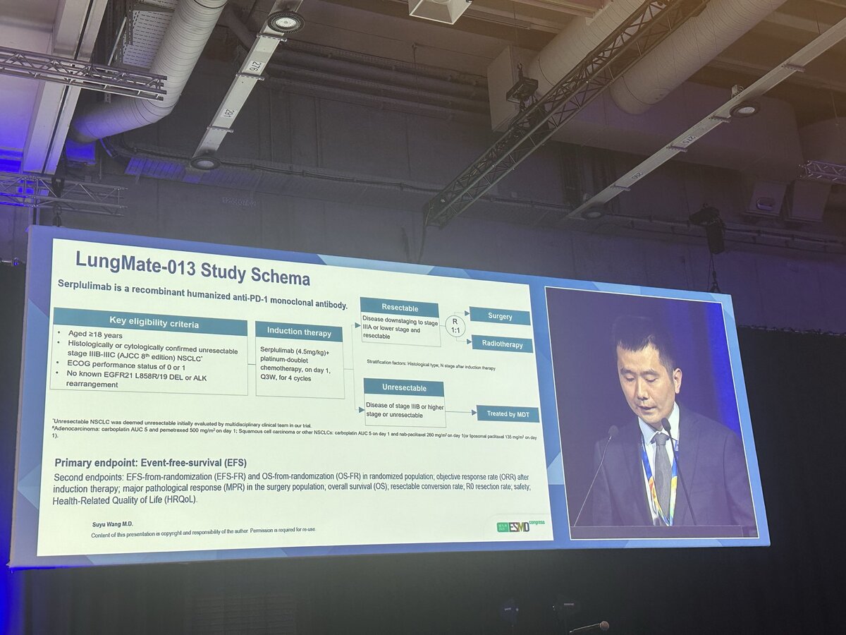 Patients with unresectable stage IIIB-IIIC NSCLC were enrolled to receive 4 cycles (q21d) of serplulimab and platinum-based doublet chemotherapy. After the induction therapy, those with resectable disease were randomized to receive surgery or radiotherapy in a ratio of 1:1, and those with unresectable disease after induction therapy were then treated by oncologists. Primary endpoint was event-free survival (EFS). Secondary endpoints included objective response rate (ORR), major pathologic response (MPR), overall survival (OS), R0 rate of resection, and severe adverse event (SAE) rate.