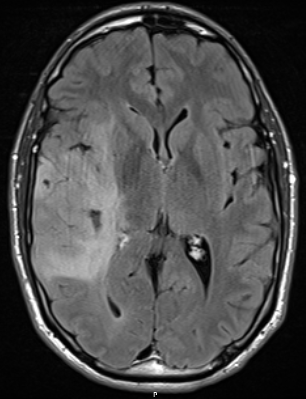 During follow up, possible progression on the left side in the MRI around the posterior ventricle.