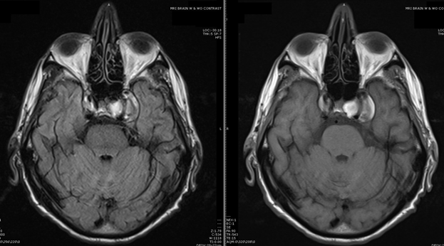 76 y/o M presented with 'double vision' and Left facial pain (V1, V2 and retro-orbital). CTA revealed b/l supraclinoid ICA fusiform aneurysms. Patient underwent coiling by IR with MRI below.