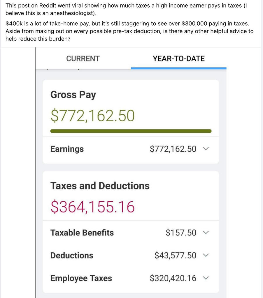 from post # 6Where did you get the number 50? The Reddit poster is at 41% total tax. I’m more than 10% less w/ the same income. So thats incorrect. State tax matters quite a bit.