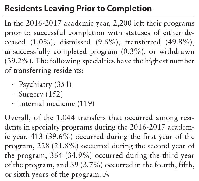 I don't know what exactly defines "withdrew" "dismissed" "transferred" or "unsuccessfully completed program" but all of those could potentially be people who tried a different field afterwards (or not). Subspecialty residents are typically fellows, so we won't count those. Probably shouldn't also count those residents who died - that brings up a full attrition rate of 1900 residents who didn't complete a program for whatever reason not including death, from a total population of 111,758 active specialty residents in the same year - that's an overall attrition rate of 1.7%/year. With the average length of a residency program somewhere around 4 years, the best overall estimate I could give is an attrition rate of ~7% for the overall population (which fits with what my gut says, so I'm going with it)