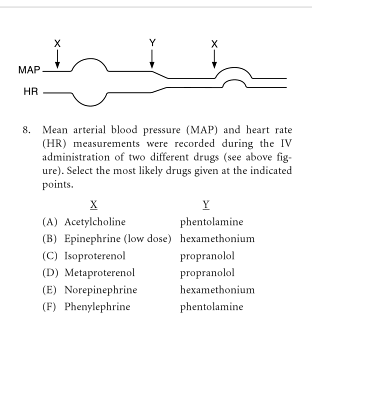 When I came back to it I would approach it like this. What is the figure showing? The answer is MAP (essentially, BP) and HR after administration of 2 diff drugs. Then I would see what they are trying to get out of the graph. Looking at the curves the MAP goes up every time after admin of drug X. So I'm looking for something that causes vasoconstriction.