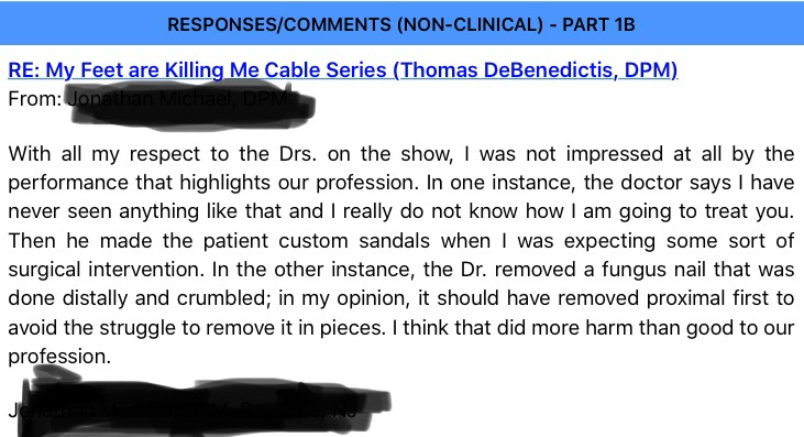 To the common person watching the show this would have been a GREAT time to educate the national audience on who we are and what we do. But now they think they are just foot and ankle specialists and not podiatrists.
