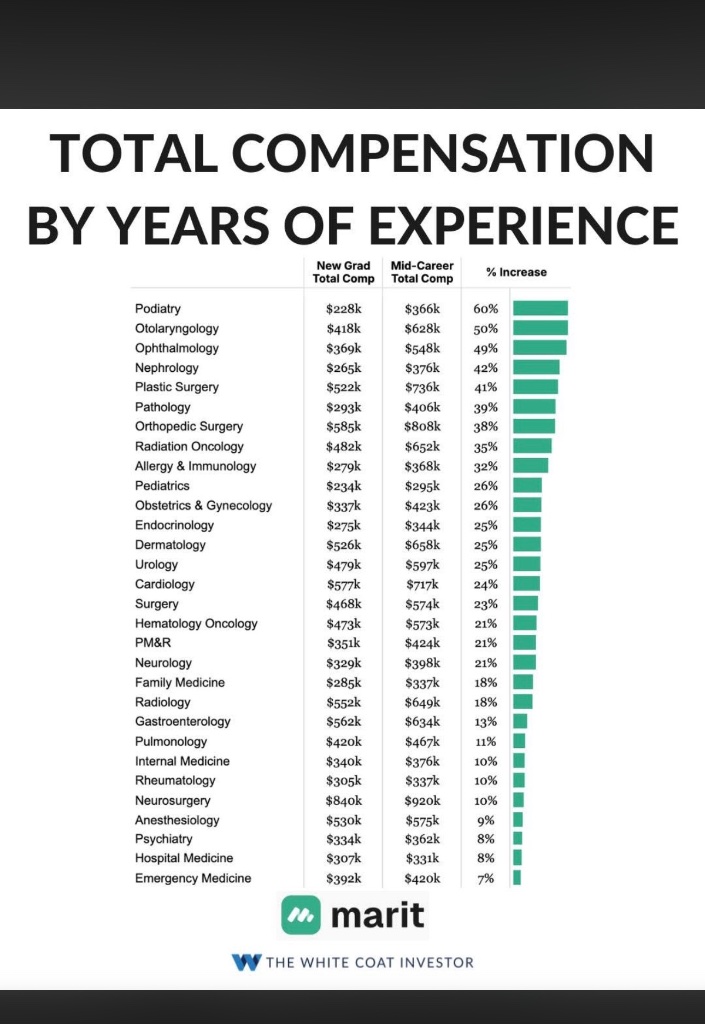 Hey all, Sam from APMA here. This graph is from this document on the Marit site: Physician Salary Growth: How Pay Changes Throughout Your Career. This is based on Sept 2025 data, so before we started the APMA/Marit compensation survey. This is NOT the updated data. The full APMA/Marit report should be going out... today? Or so?Podiatry has an increase in salary with experience more than any other speciality?