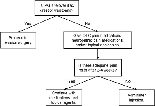 43]. If patient has an increased risk of infection (e.g., diabetes, immunocompromised status) or of coagulopathy, injections should be deferred or used with caution. In both the injection and no injection groups, if conservative therapy fails, we have generally moved our batteries cranially or caudally on the same side if a waistband or iliac crest issue existed. "