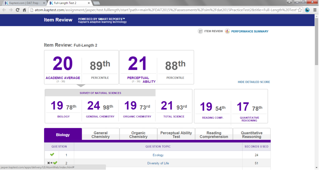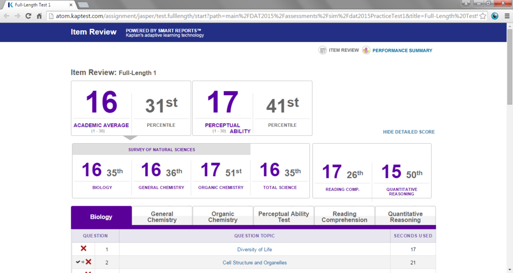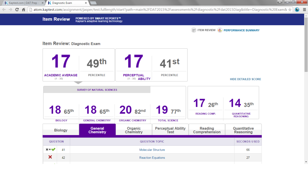 I'm going to post my diagnostic score now, and in about 6 weeks, post my final practice exam score. Anyone else who has/is taking the Kaplan DAT course is also welcome to post their results. Also, if you've taken the course AND the DAT, it would be especially interesting to see how the scores correlate!!