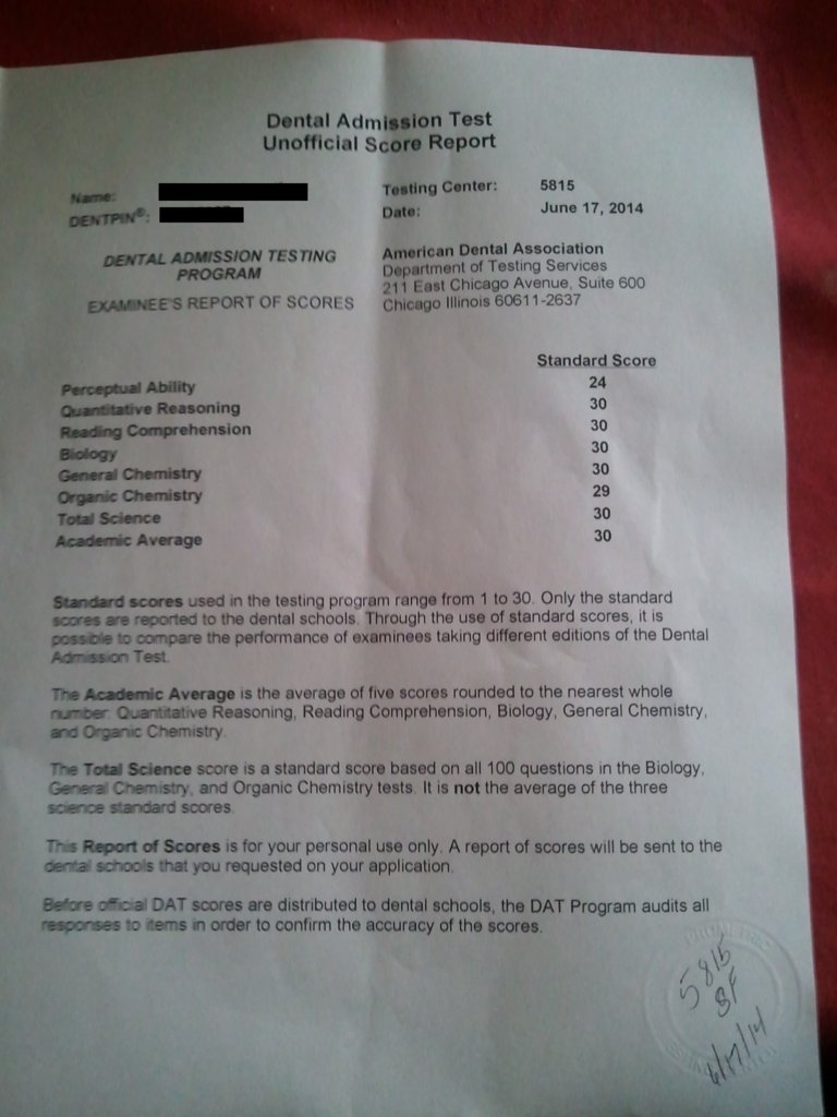 I took about 16 full-length practice tests altogether. I didn’t do an entire test all at once. Rather when you put all the practice sections I did together, it comes out to about 16 practice tests. I used practice tests to identify the areas I had problems with and needed additional review for. Any questions you miss, do over the next day, and review that particular area in bio/chem/ochem etc. Don’t be overly concerned about the scores you receive on the practice tests. In fact, all the practice tests minus the ADA 2007 practice exam were harder than the real thing. So don’t fixate on the scores. Instead focus on improving on the areas where you miss questions. Repeat any sections where you miss questions. My practice test scores were much lower than I did on test day, and I am providing them for reference. Also, the scores recorded for my bootcamp practice tests were for my second time through their practice tests. Qvault scores were for my first run through. Any science/math section you see in the spreadsheet where I didn’t score a 30, I would do again the next day and maybe even again the day after that until I got a 30 on that practice section.