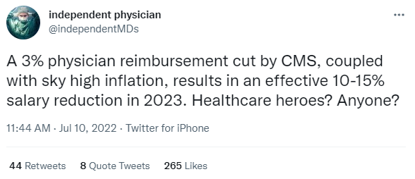 So to recap, academic health systems scoop up formerly private practices, salaries to staff that site are significantly reduced, then on the other side we have CMS cuts and inflation.