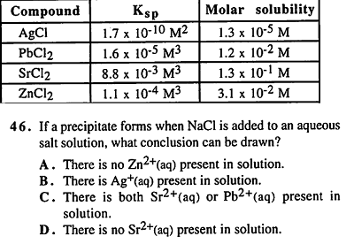 I understand that adding Cl- to Ag+ solution will precipitate out AgCl, so the answer is B. According to the table, the magnitudes of molar solubility for Ag, Sr, and Zn with Cl- are 10^-5, 10^-2, and 10^-2 respectively. Adding Cl- will precipitate out Ag but not Sr and Zn, which is probably explained by the difference between 10^-5 and 10^-2 values. Is there a molar solubility cutoff point at which it is safe to say that something will precipitate or not?