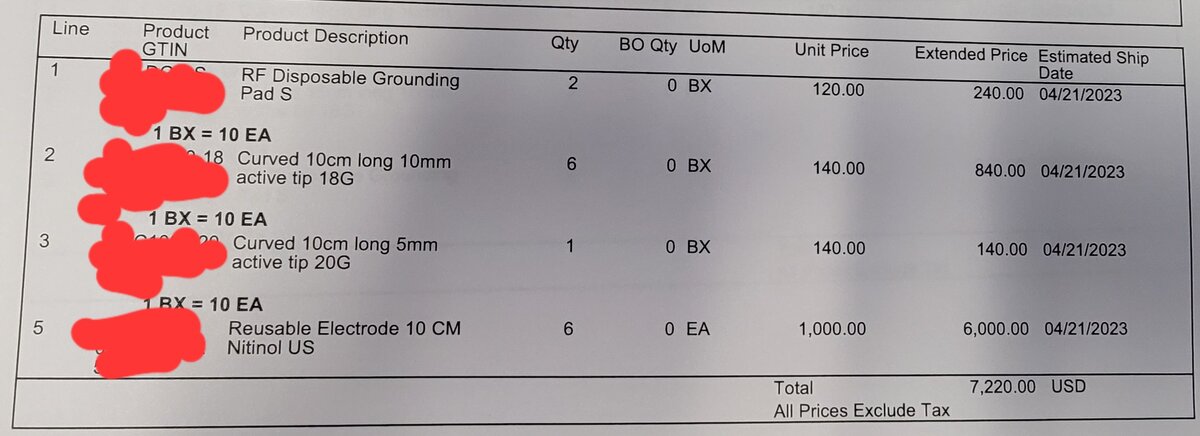 Abbott, with no warning, has increased the cost of a box of 10 RFA needles from $140 to $300. We didn't realize it.