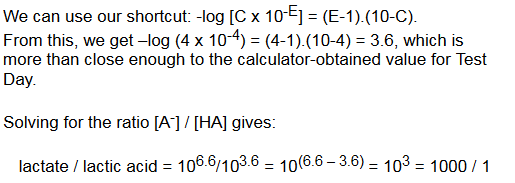 "Solving for the ratio of [A-]/[HA] gives: lactate/lactic acid = 106.6/103.6 = 106.6 - 3.6 [my rounding of the pKa at 3.4 was a little off from there's] = 103 = 1000/1"