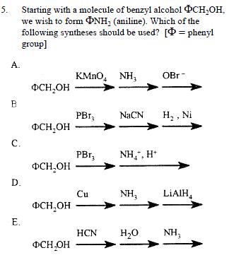 B. I think PBr3 changes OH into Br and then we got primary alkyl with NaCN. Which reaction is it? E1, or Sn2? I don't think it's E2 and SN1 because they prefer tertiary. If it's elimination rxn, then it forms alkene so H2,Ni will break the double bond and form C-C but if it's SN2 then I don't know what H2, Ni can do. Is Ni same as Pt and Pd when it's with H2?