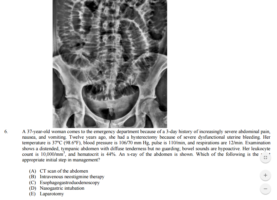 6. She has a partial small bowel obstruction, since she still has some bowel sounds. So go conservative first: IVF, NG tube to decompress, NPO. If it worsens or she goes peritoneal-->ex-lap.