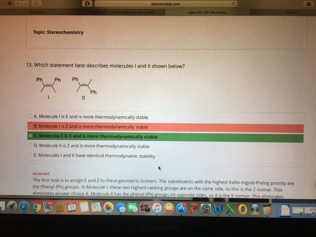I was asking DR Romano about this question and I still got it wrong ! In my thinking process I though that E or Z the E will be non polar so it would be less thermodynamically favored! Am I confusing subject with CIS or Trans! I would love to get feedback from Dr, Romano on this!