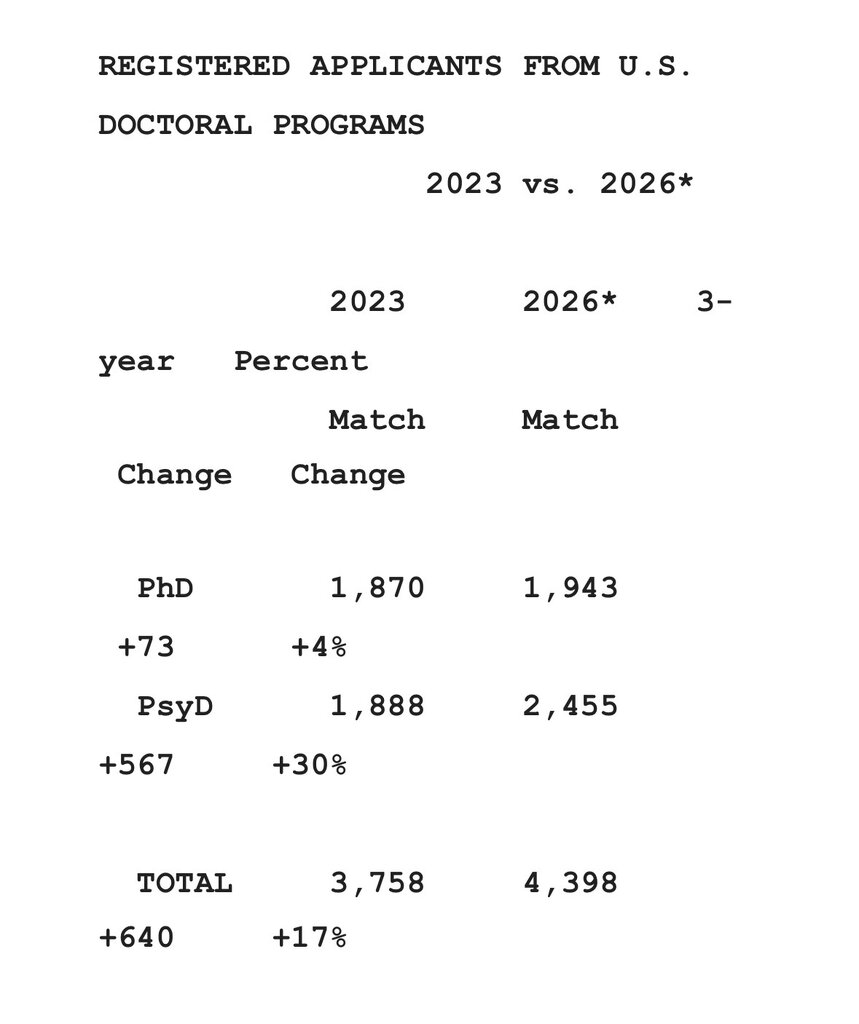 A huge part of this imbalance - 89% of the growth in the applicant population - are from PsyD students. I really try not to buy in to the dogma against PsyD students who often get an unfair and undeserved rep but I can’t help but think this is sort of the downstream consequences of the ever increasing diploma mill cohort sizes and the general lack of the gatekeeper function in most training sites. Unfortunately, most of those operate under PsyDs, which isn’t helping the situation.