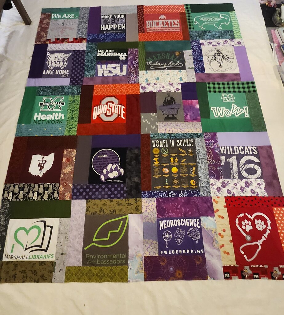 And this one I'm making for myself as a got-into-vet-school gift; it's a pretty simple t- shirt quilt, but made from shirts I've collected from the schools I've attended over the past decade (and a couple I bought for tOSU since i haven't started yet lol). the pattern is simple but the scale is challenging my will to live 😅