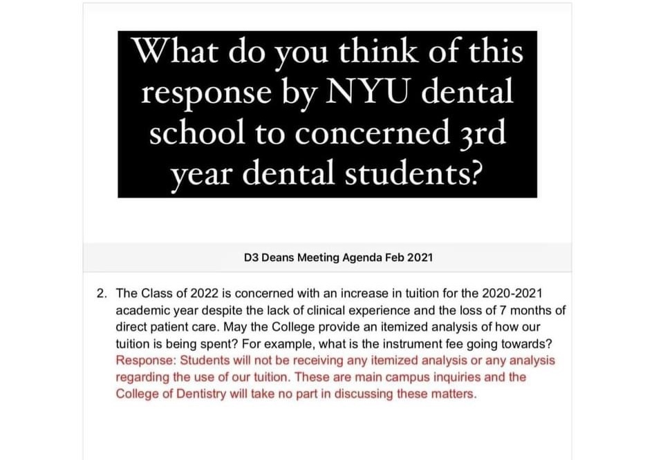 Lastly, NYU didn’t even tell us anything. They did not just not say the third, they don't say ****. Not a single email was sent about summer break changing or the vaccine eligibility thing. The thing that tip us off was “syllabus updated” in lab. They have said nothing on any issue to the D1s. Every piece of info came from other students on the student council or individually emailing the professors.