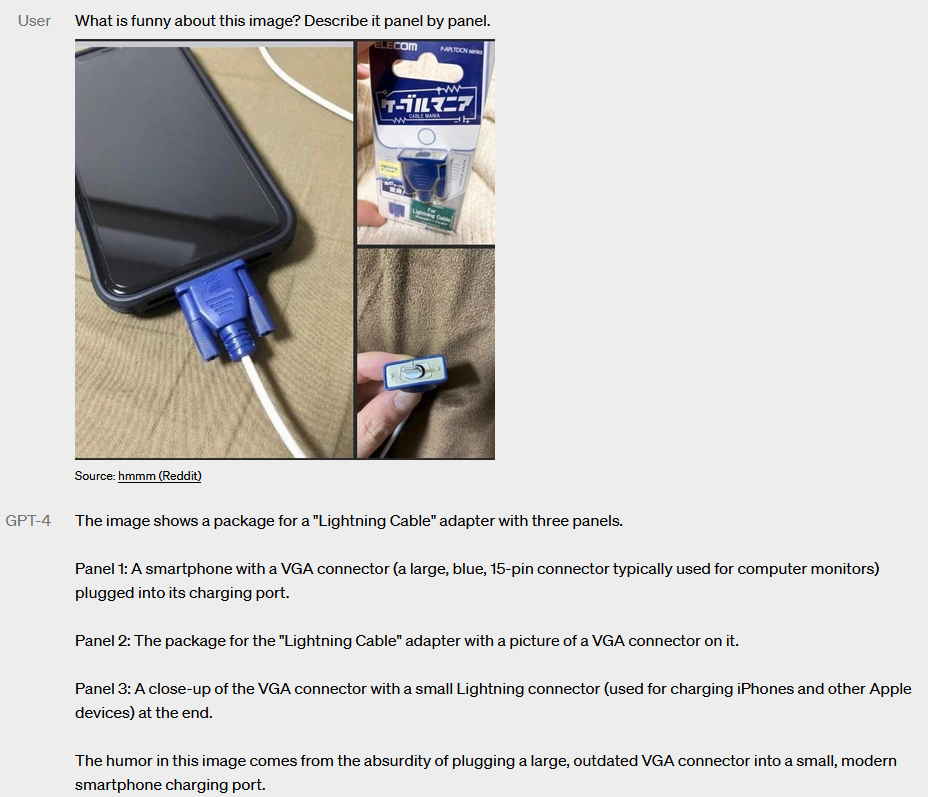 This article (This VGA Prank Charger Transforms Your Charging Cable into a VGA Cable) and variations are posted on dozens of forums with replies that gpt-4 probably derives its answer from. Seems that it is essentially paraphrasing information rather than explaining a novel situation using logic derived from the dataset. The example is impressive for different reasons, but I think it's exaggerated in the context (your post).