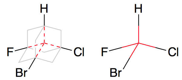 With adamantane derivatives, the groups attached have pretty rigid geometries. Because of that, the Cl, Br, CH3, and COOH groups in the molecule you posted are "stuck" in a fixed position pointing away from the ring structure at all times. This is due to steric strain and geometric limitations due to the ring. If you draw a line from each group to the center of the ring, you'll end up with something like this: