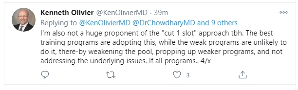 To me, with all the information that is out there its just incredible that there are even 100 US MD applicants out there applying to a specialty that has a possibility of providing no real future once there are done with training. KO's four tweets are a joke. This guy has been gaslighting med students for years telling everyone that posters on SDN are fake or just don't understand whats going on and that everything is great. There is no will for ASTRO to do anything about this, as the current president is the poster child for these problems. Opening a program that is not needed and then just SOAPing in residents because the program is just that bad. People like that should be shunned and not made president of ASTRO. That alone just tells you everything you need to know about the total rot at the top of our specialty. There are numerous other examples of this rot like members of ASTRO not being allowed to tweet their own opinions and don't even try to say anything on RO Hub. The over training of residents problem is super easy to fix at least in therory if the problem is acknowledged. All training programs must have an employed radiation biologist working in that field and all residents must be clinically competent in brachytherapy as shown by having 80 cases or whatever during training. That alone would force the closure of many of these not great programs.