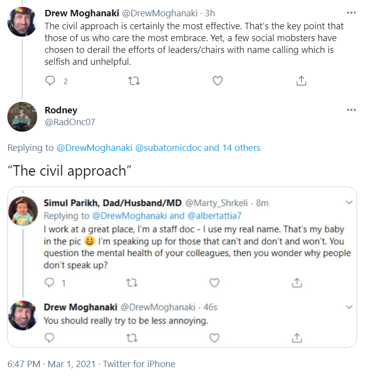 What comes to mind is that we've had some PDs give it a go over the years. One of them told my online identity that I should not be employed as a rad onc because of what I post on this site. If Drew means at ASTRO or other public forums, all I can say is that the message is well controlled there. Lisa Kachnic even brought an ABR lawyer to an ARRO talk once. We got called children by Anthony Zeitman at a conference talk discussing oversupply years ago. Now that is mob mentality.