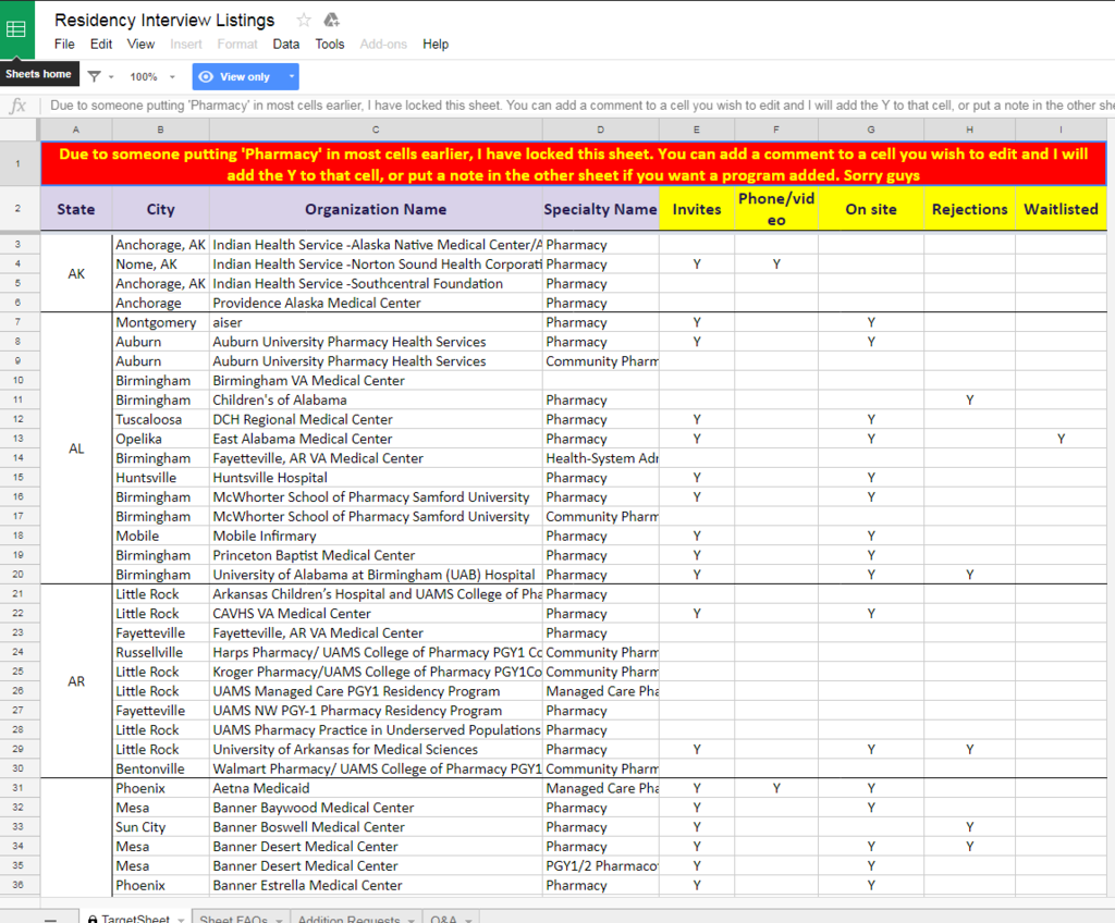 Here is a screen shot of the residency interview listings from last year. A lady named Katie Anne created it. I wonder if someone else could create it as well.