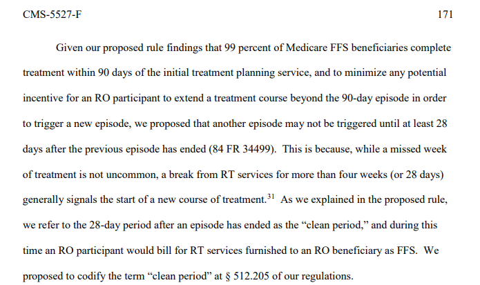 For me, the most obvious choice would be - patient with metastatic disease is referred for bone met palliation. That provider treats with 8x1, because it's the same reimbursement no matter what. In 60 days, patient develops a new lesion which is painful. Patient is re-referred. Based on the current wording, each episode is 90 days with a 28 day "clean period" at the end of the episode. So, is that provider going to rush to see that patient again, knowing they won't be reimbursed FFS? Or is that patient going to get bumped to a much later date, a date when a new episode can be billed? Will there be "second class citizen" patients, where people with private insurance get priority and people with Medicare are seen with less enthusiasm, the easiest/quickest treatment regimen is chosen, and re-referrals are pushed to when a new episode of care can be started?