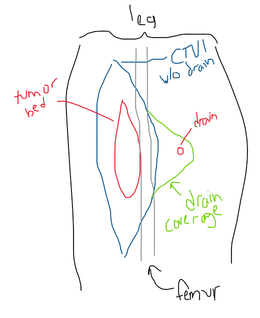 I took a cartoon of a sarcoma from a paper and edited. My patients disease/operative bed goes no where close to deep bone so operative bed is in red. in my patient the red surgical bed is superficial. However, the drain is almost medial/midline. A nice little tangent plan will cover the operative bed well, but I'm concerned that if I treat the drain site it will increase lymphedema risk more. Do I have to cover this drain site? Is is worth it to maybe put an electron patch there? Or just forgo it the drain site.