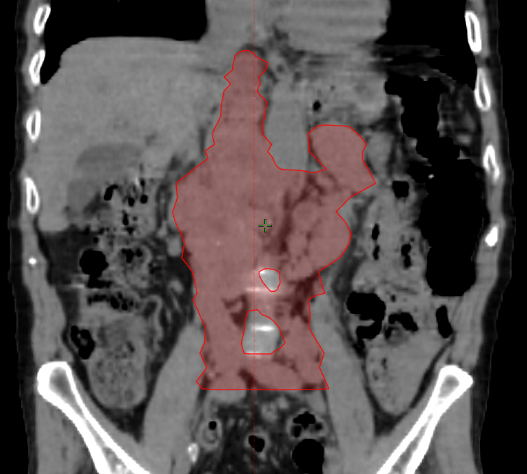 It's vessel. There's upstream venous congestion. Adenopathy is 7 cm AP/PA direction. There are some smaller nodes further south along the let iliac, but I had to stop somewhere. Resimming tomorrow after 12 Gy given shrinkage.Tough to tell what's adenopathy/bowel/vessel from one slice, but it looks like what I presume is a right common iliac node is getting short changed.