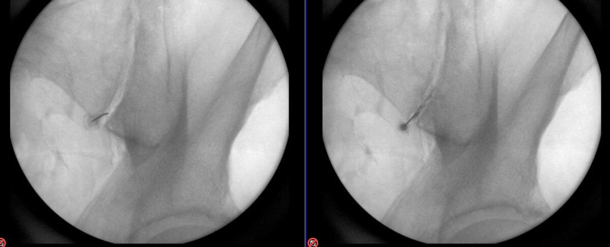 This is on the right side - not a true AP. The fluorscope is tilted caudad (with reference to the detector, not the source) and contra-lateral. The caudad tilt brings the Posterior Superior Iliac Spine (PSIS) to (about) mid joint. Then, rotate contralateral (towards midline) until the two joint lines cross just under the PSIS. This will usually give a flashlight sign - meaning, you get a small square that lights up. This is your spot. It is extremely rare that if you line it up as such, that the needle doesn't slide in the joint.